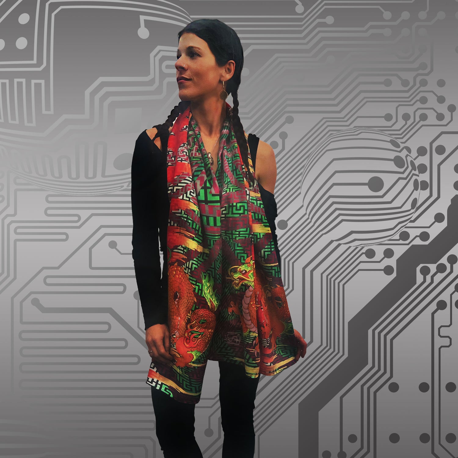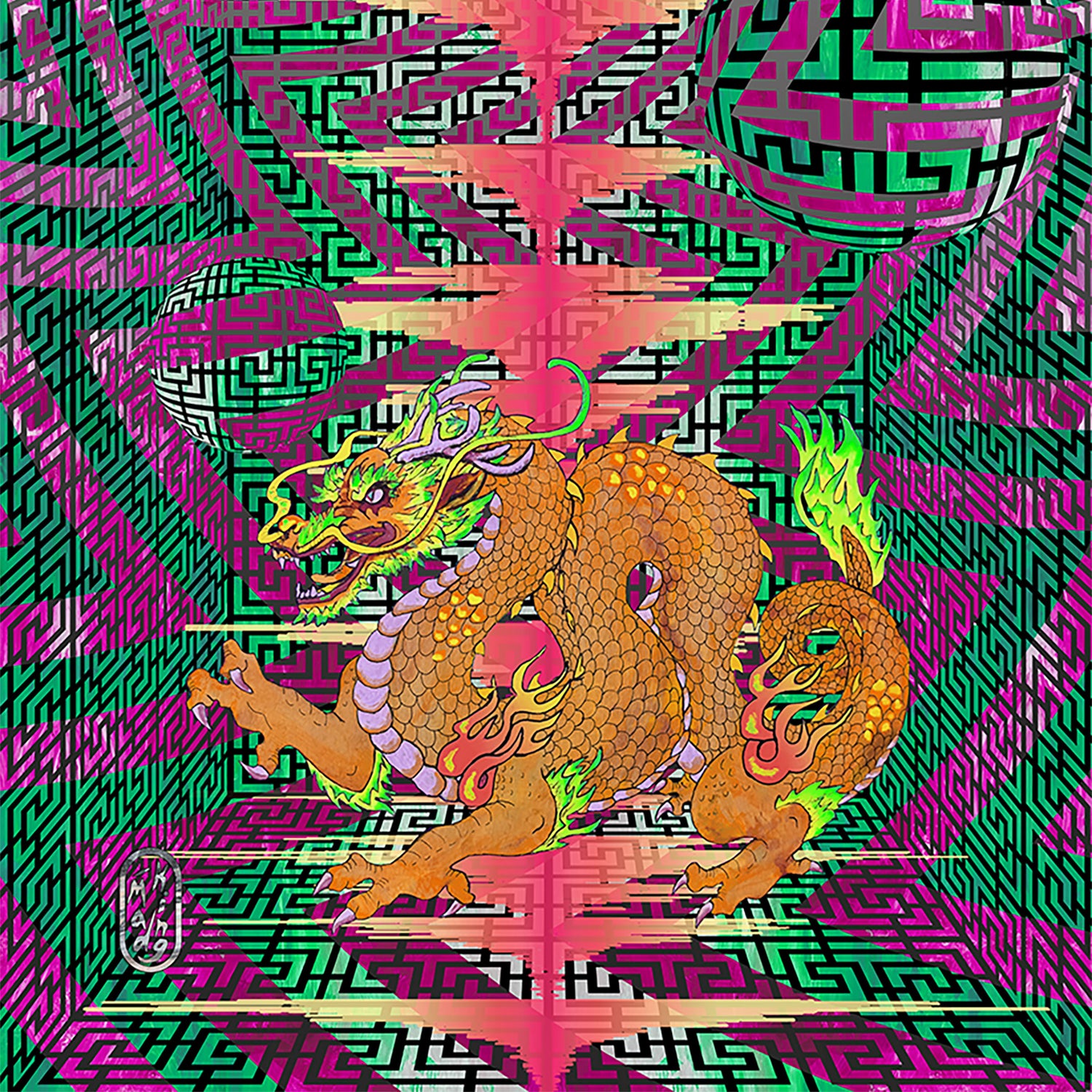 This Big Beat Pashmina measures 78”x24”, using dye sublimation printing on a 80%wool, 10%silk, and 10% cashmere blended fabric that is deliciously soft to the touch, super luxurious, and can be worn in a number ways. The dragons featured on this pashmina were sampled from the Mad King Painting, "Chen Long and Zhou Long continue on their quest to conquer and catalogue the hardest beats" made in collaboration with Mad King's lovely and very talented art assistant Cristal Aurelia. Not only are these gorgeous and reasonably priced, but we had each pashmina individually blessed by a "high" Minister of the Church of the Flying Spaghetti Monster. Made in a limited edition of 22 each pashmina comes with a signed and numbered mini print.